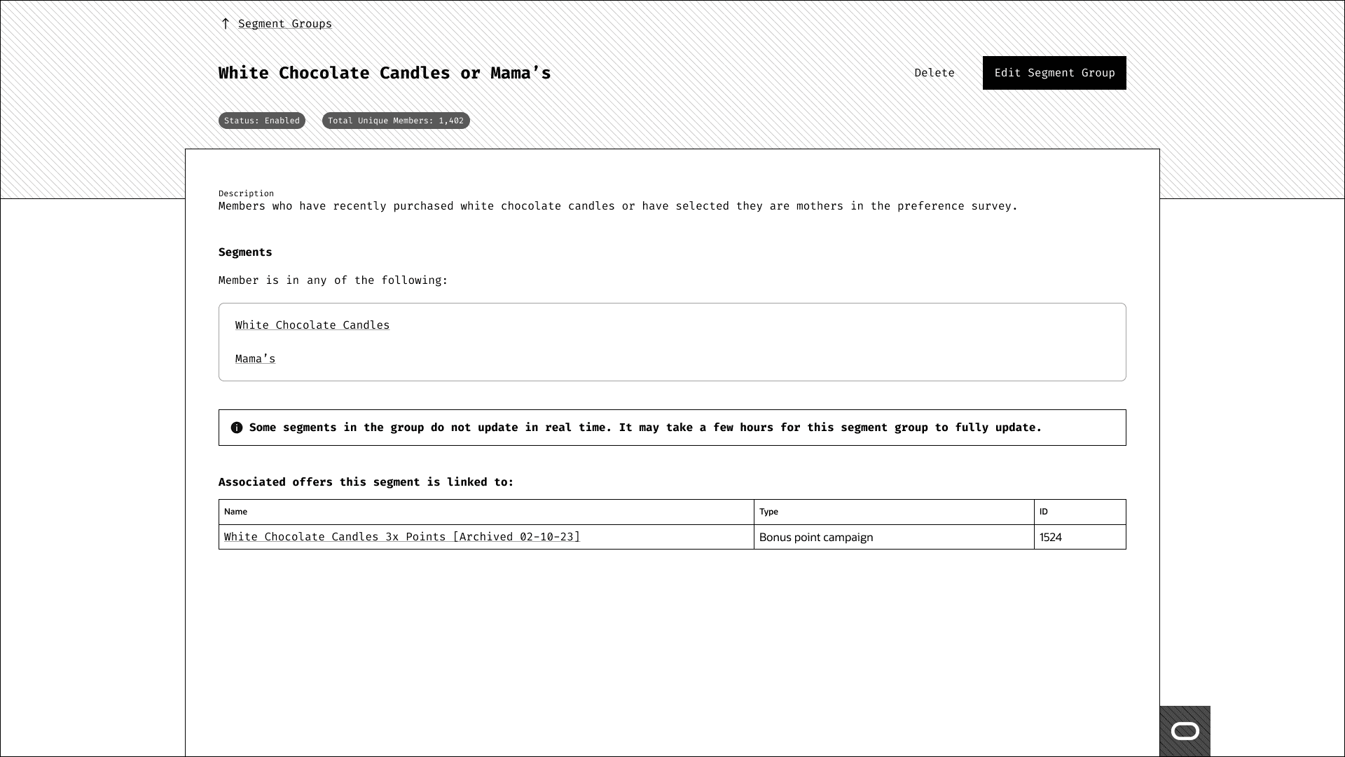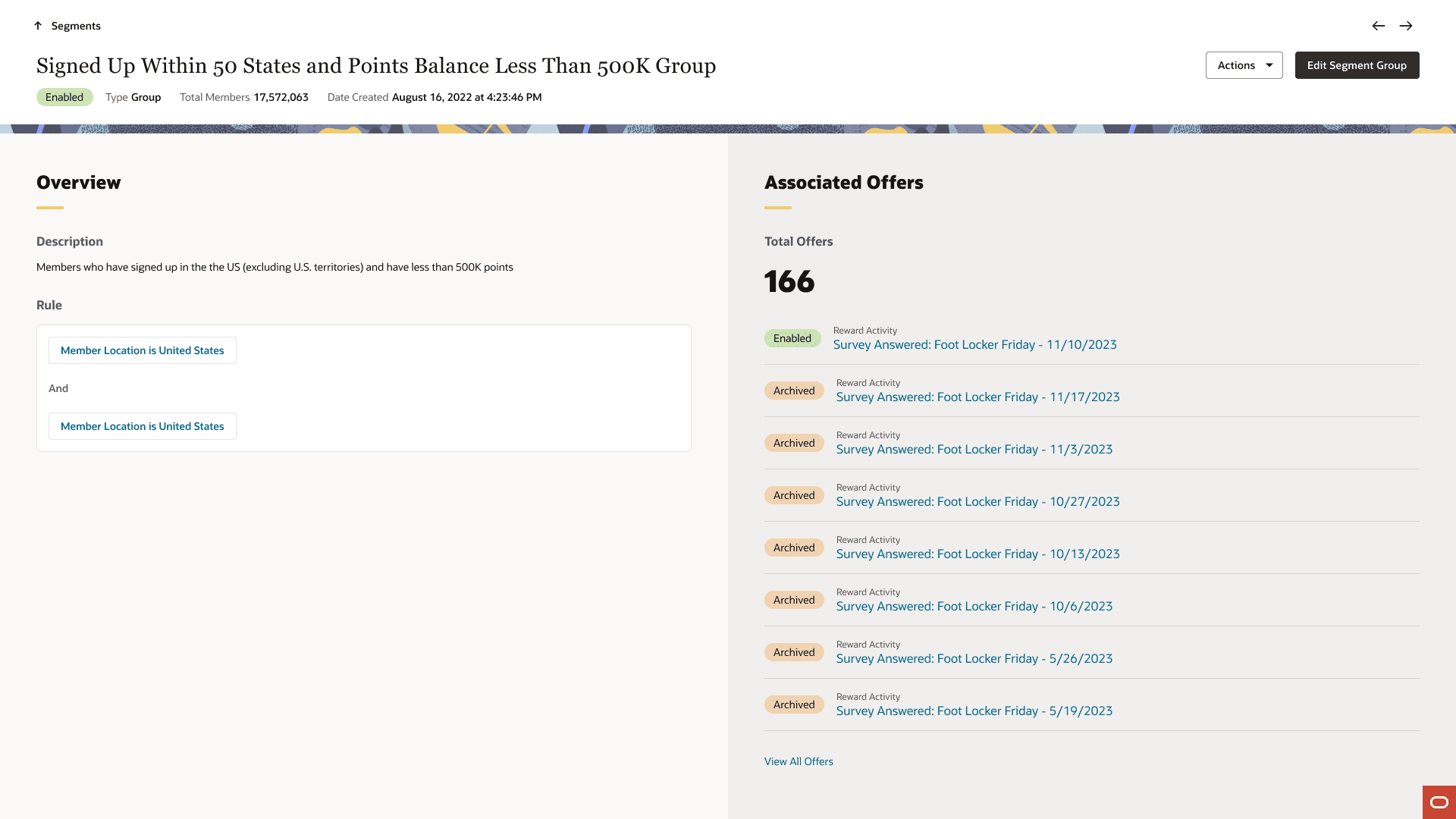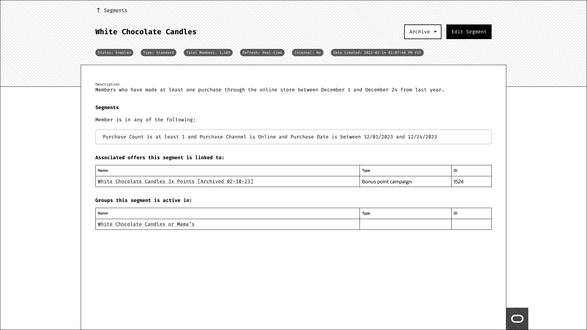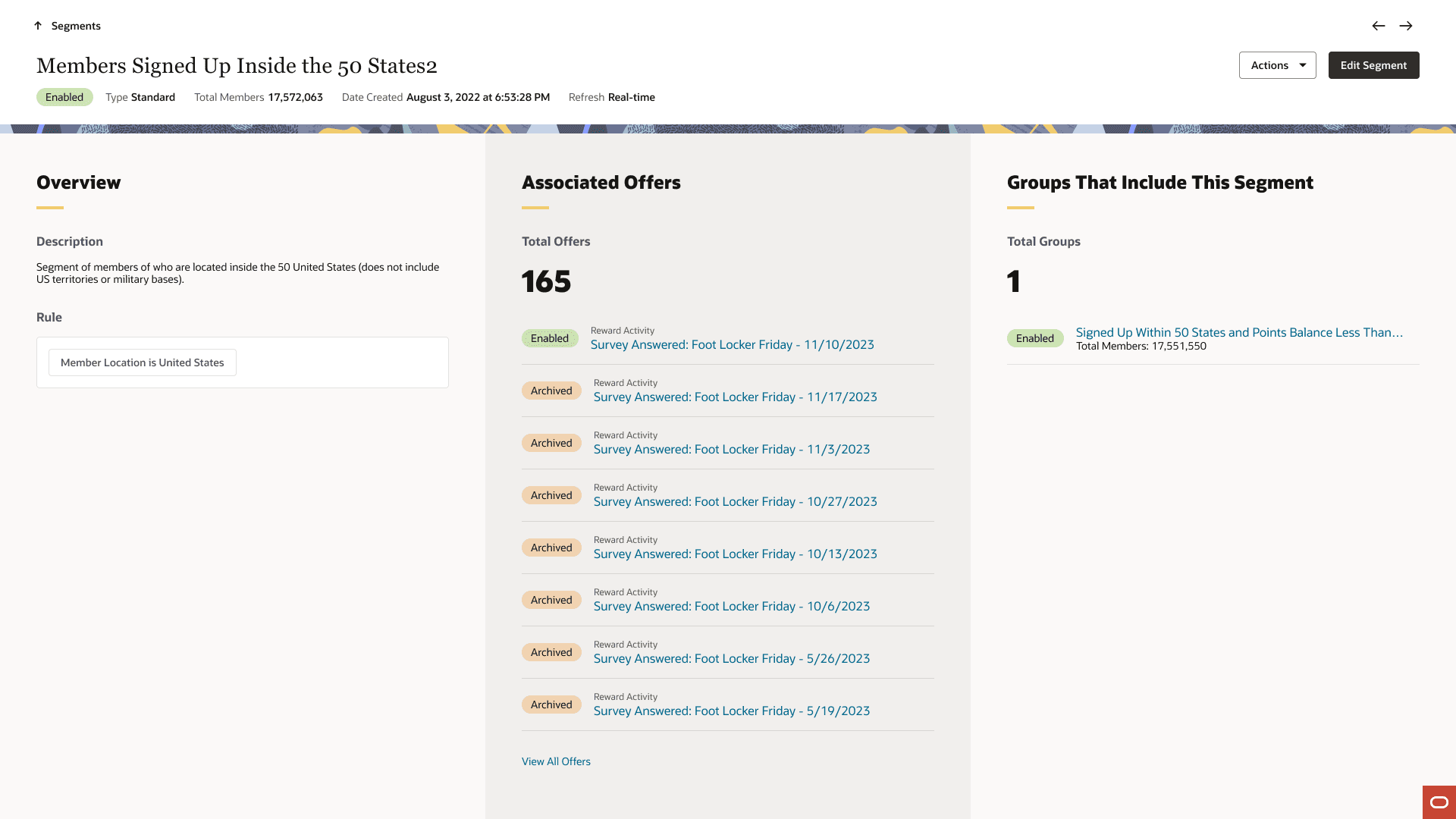 Another thing I heard periodically was the utilization of the detail pages. Many of the users didn't want to see all of their associated offers and segment groups tied in the page since they can grow quite large. One customer had over 150 offers tied to a segment. You can imagine the need for an overflow was very much a must-have. So, I divided the section of the page up into key pieces and went on from there.