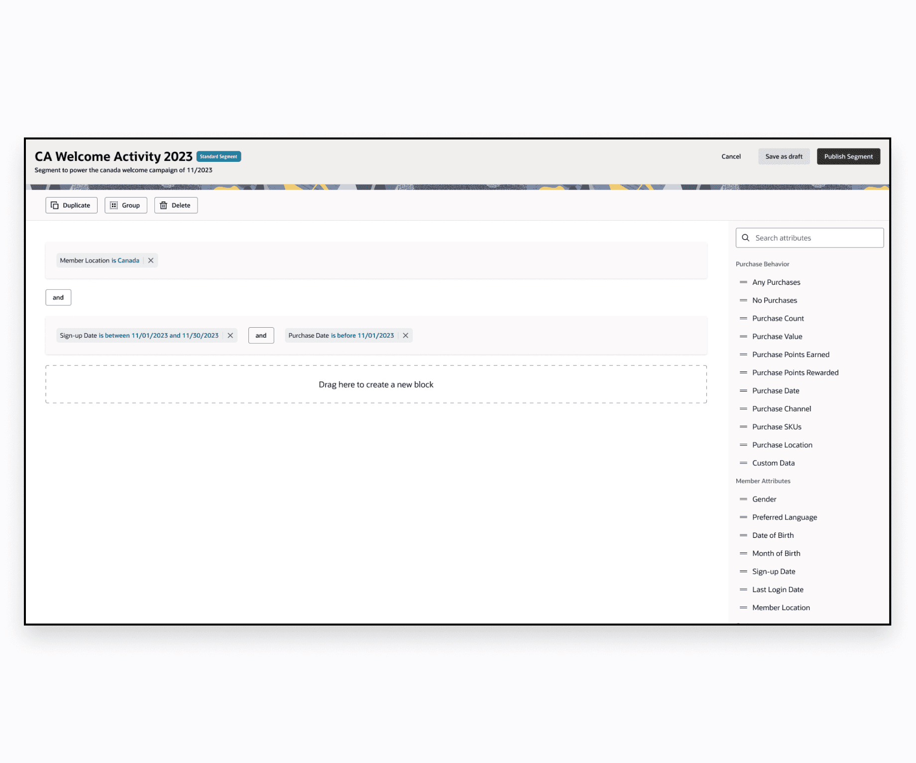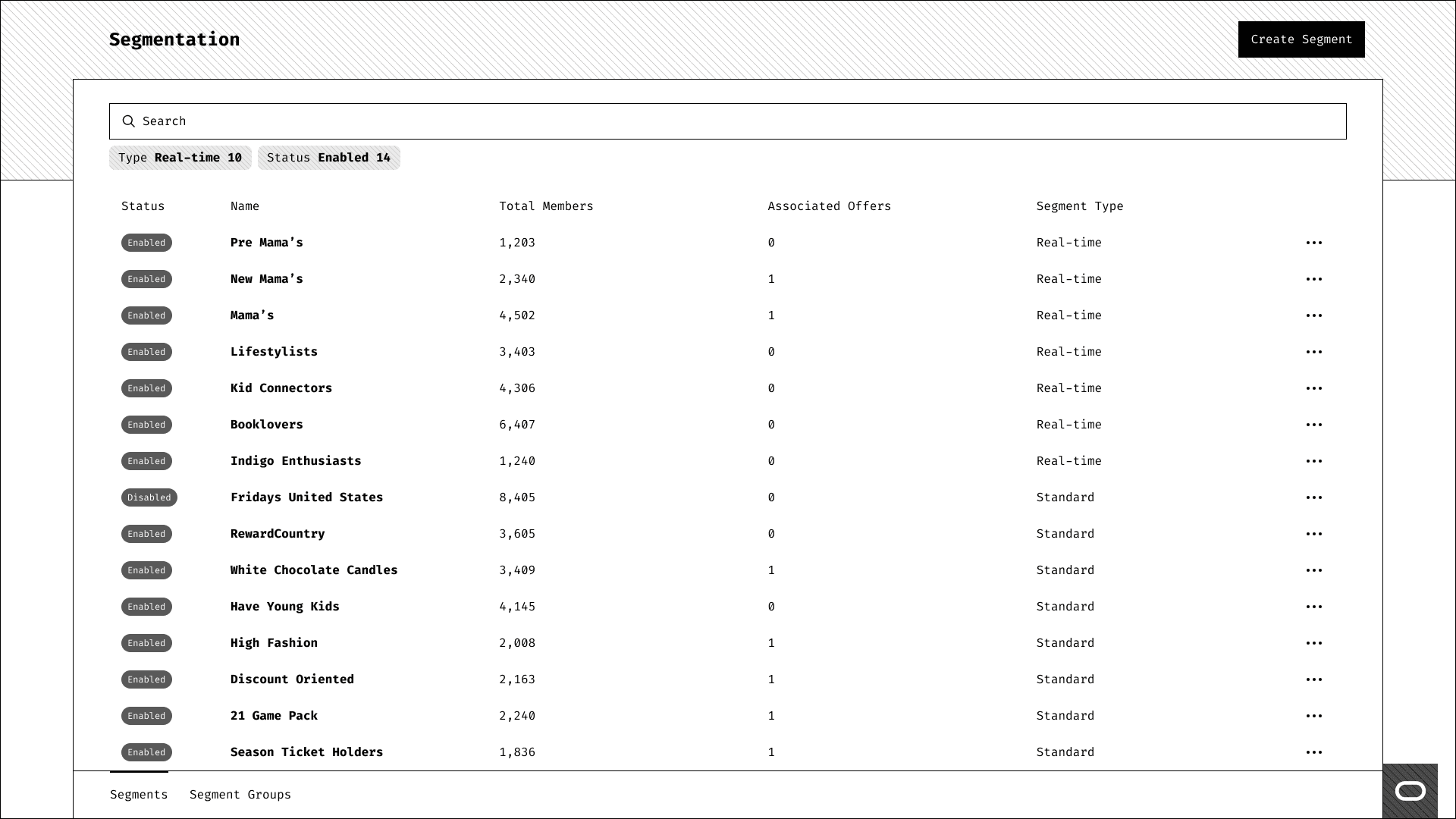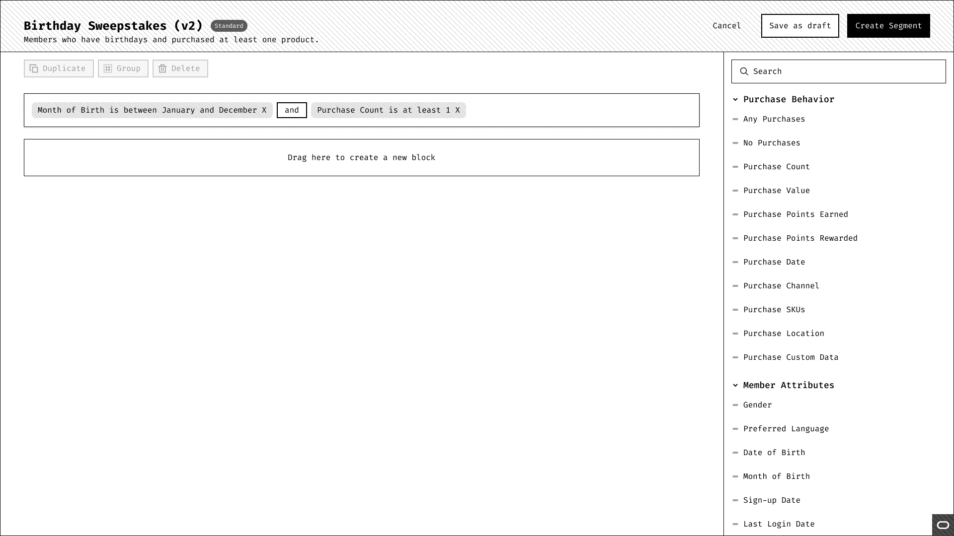 We went through the lo-fi wires with a focus group of current CrowdTwist customers and the feedback was excellent. I did notice in the sessions that users rarely went to the Segment Groups tab and when I asked about it, their answer was that they didn't know it was there. After discovering its use, it gave users new ideas on what it could be used for in terms of intersecting audiences. Based on this, I went back to the board and made the experience more intertwined with each other rather than separated. After all, the tables, detail pages, and rule builders were very much the same.